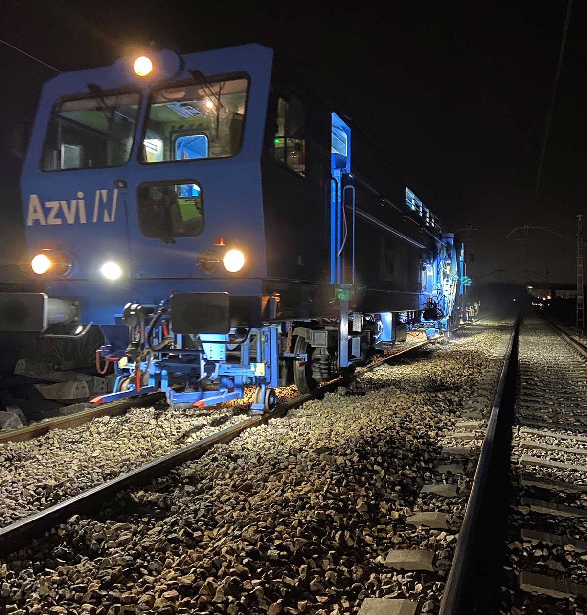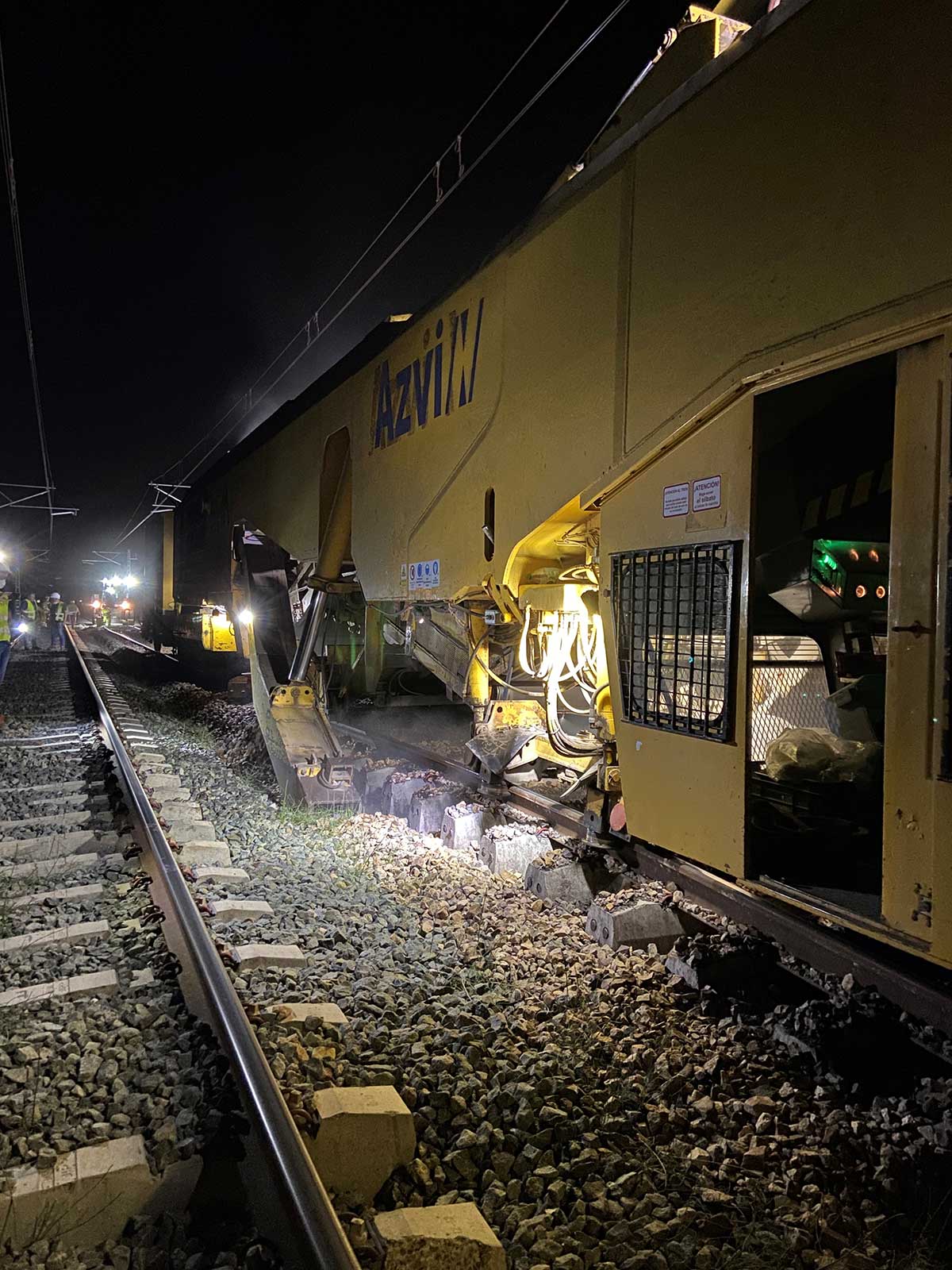 El Plan de infraestructuras ferroviarias en el núcleo de Cercanías de la Comunitat Valenciana 2017-2025 contempla la realización de las actuaciones necesarias para garantizar el óptimo estado de la vía y del sistema de electrificación la infraestructura ferroviaria, con el fin de asegurar unos mayores niveles de fiabilidad, disponibilidad y confort de las instalaciones. Renovación de vía y catenaria en el tramo Silla-Pobla Llarga, perteneciente a la línea C2 de Cercanías de la Comunidad Valenciana, con el fin de mejorar la fiabilidad de las instalaciones, aumentar su durabilidad y se reducir las incidencias, así como el tiempo de los trayectos. El contrato incluye la renovación de las vías de apartado de las estaciones de Silla, Benifaió, Algemesí y Alzira, que se adaptarán para el estacionamiento de trenes de 750 m de longitud. Los trabajos se están realizando por la noche para no afectar al tráfico diario de Cercanías, Media y Larga Distancia o Mercancías que circulan por esta vía, siendo el rendimiento diario de 540 m de doble vía (1.080 m de carril) y 900 traviesas por noche. Dentro de los trabajos contemplados en la obra en ejecución, tras haber realizado la sustitución del carril y traviesas existentes por carril y traviesas nuevas, se ha llevado a cabo la realización del desguarnecido de la misma. El desguarnecido del balasto se está realizando con maquinaria pesada propiedad de Azvi: El desguarnecido consiste en la retirada mediante el empleo de maquinaria pesada del balasto existente bajo la vía por encontrarse muy deteriorado por el paso tanto de circulaciones de pasajeros como trenes de mercancías. Asimismo, se aporta balasto nuevo con un tren de tolvas para volver a llevar a la vía a cota previamente prefijada. Para este trabajo se emplea el equipo formado por bateadora y perfiladora. Además, se emplea estabilizador para acelerar el proceso de compactación que dota al armazón de vía de estabilidad y limita sus asientos por el paso de circulaciones. Cercanías Valencia | Renovación de vía y catenaria