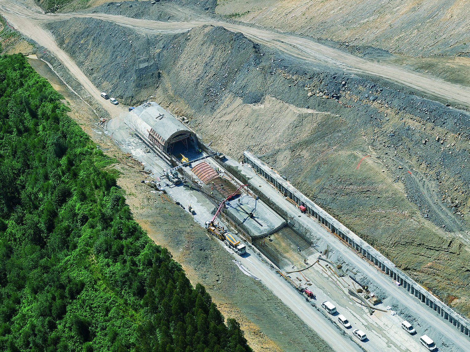 Finalmente, las entradas y salidas de los túneles se han completado mediante falsos túneles de bóveda prefabricada, procediendo posteriormente a su relleno y restauración ambiental.