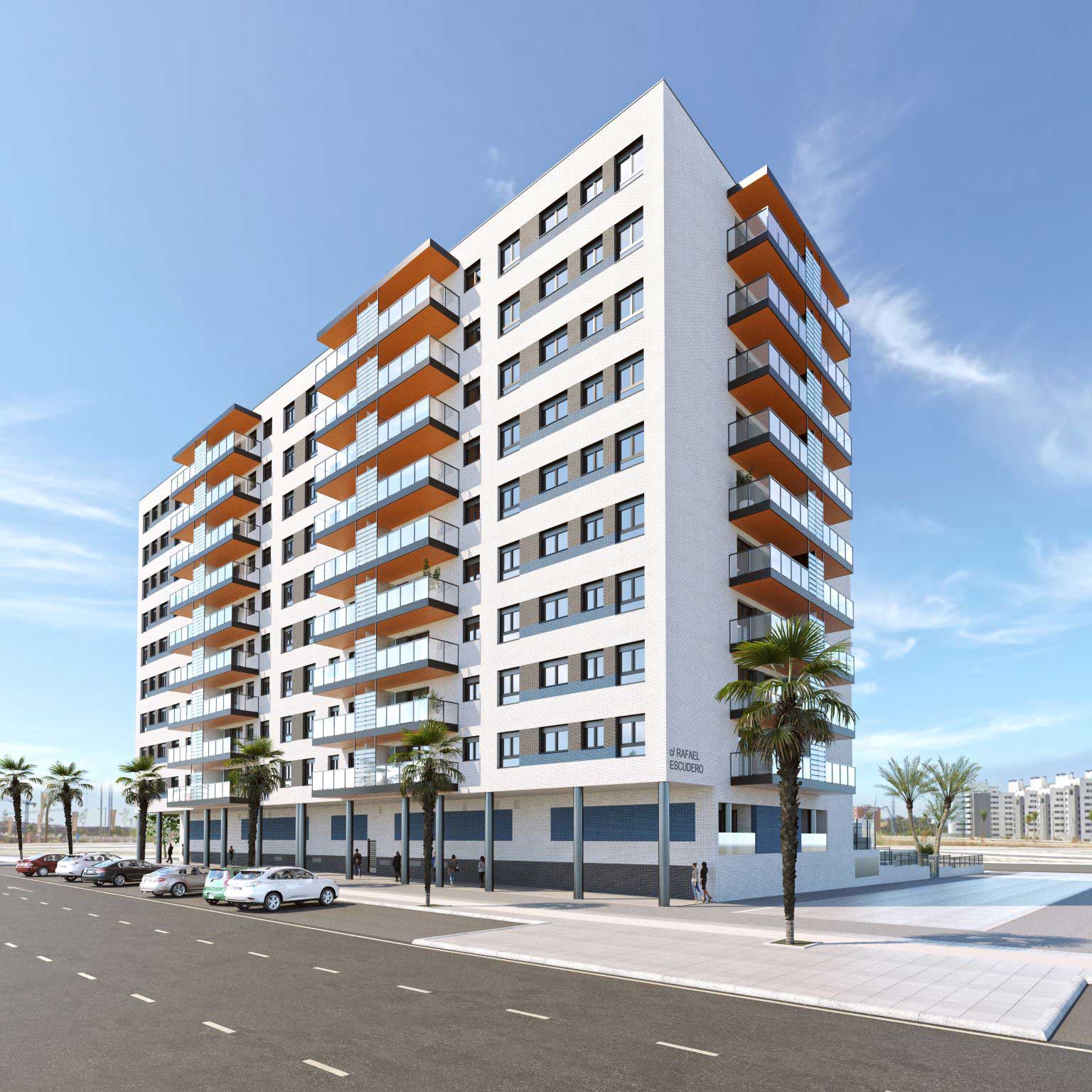 Proyecto de construcción de un moderno edificio de nueve plantas que cuenta con piscina, parque infantil, zona de fitness, pista de pádel y zonas ajardinadas.